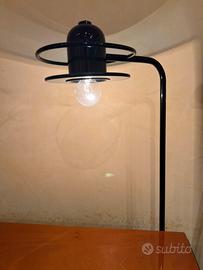 Letto matrimoniale in ferro laccato nero con inserto in cuoio completo di comodini scorrevoli sulla guida del letto e due lampade