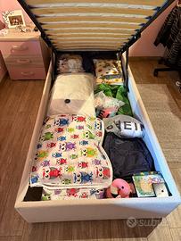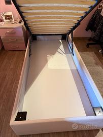 La testiera imbottita color beige chiaro dona un tocco moderno e raffinato, facilmente abbinabile a qualsiasi tipo di arredo. La struttura è solida e ben tenuta, ideale sia per adulti che per ragazzi.