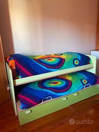 Letto con secondo letto estraibile e cassettoni. Color acero e verde mela. Buona fattura, buone condizioni. Piccoli segni di usura che non ne inficiano l’uso. Svendo per cambio arredamento. Setteville di guidonia Prezzo trattabile.