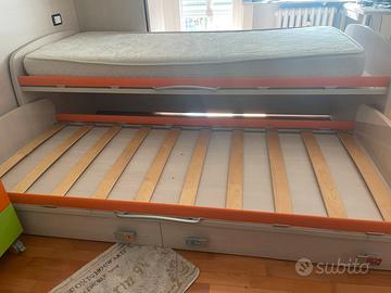 Guadagnare spazio nella camera dei ragazzi è una impresa, a volte, difficile da affrontare. Space è una soluzione giovane e dinamica composta da letti singoli, indipendenti e dotati di ruote che scorrono l'uno sull'altro. Un sistema geniale che si completa di una versione con due piani scrivania estraibili e di una scaletta a pioli con maniglie in plastica, per consentire di salire con comodità al letto superiore.
