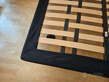 rete in doghe di legno con robusta struttura e piedini in acciaio nero bordo in gomma piuma rivestito in velluto nero. testata in legno nero opaco fissata direttamente alla struttura del letto. dimensioni 205x160