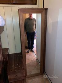 letto con retro letto tutto in abete massello spazzolato e verniciato colore noce. composto da : 1 letto singolo con due cassettoni , materasso in lattice 180 x 74, retro letto con elemento a giorno più due ante, scaletta con due cassettoni, colonna appendiabiti con anta a specchio, letto matrimoniale sovrastante scorrevole, leggermente rovinato sulla testata, riparabile in pochi minuti..
