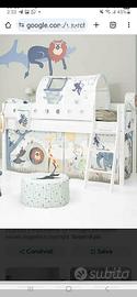 Letto semi elevato flexa con scivolo. Secondo letto singolo della stessa serie. Tessuti serie giungla: galleria che si può mettere sul materasso o libera sul pavimento, tipo tenda, tasche portaoggetti, tende per la zona gioco, cuscino poggia testa che si incastra sulla spalliera, tappeto ikea giungla.