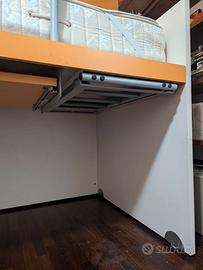 Letto singolo con struttura rialzata, scaletta e scrivania estraibili (possibilità di acquistare anche il secondo letto con doghe e ruote. Si trasforma così in un letto a castello).