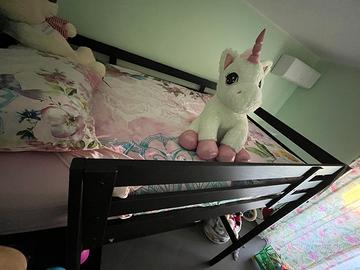 Causa cambio cameretta vendo letto ikea con soppalco legno nero. Letto superiore una piazza e mezza, letto di sotto una piazza trasformabile in letto matrimoniale (rete allungabile, due materassi singoli sovrapposti quando è chiusa e quando è aperta in modalità matrimoniale la rete entra tutta nella struttura del soppalco). Letto di sotto singolo con cassettoni porta lenuzola ecc. Inclusi i tre materassi. Pensato tutto al dettaglio quando comprato e usato solo in tre occasioni per ospiti. Ottima soluzione salvaspazio e versatile.