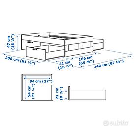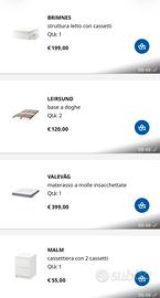 Vendo camera da letto completa e come nuova, tutto perfettamente tenuto e funzionante senza graffi o difetti! Armadio non presente. VENDO SOLO IN BLOCCO (tutto o niente! Non scambio, non spedisco!) Il pacchetto è completo di struttura letto contenitore 4 cassettoni laterali con dimensione 160x200 del valore di € 190 modello BRIMNES bianco con 2 basi a doghe in legno 80x200, regolabili in base al peso della persona che ci dorme sopra modello LEIRSUND del valore di € 120 + materasso a molle insacchettate sfoderabile 160x200 tipo media rigiditá modello VESTERÖY del valore di € 399 + 2 comodini 2 cassetti modello MALM colore bianco del valore di € 110 + testiera letto in legno rovere chiaro con 4 mensole bianche modello MANDAL del valore di € 170 Vendo per cambio progetto e immediato sgombero! Valore commerciale del pacchetto € 998 Vendo ad € 550 con ritiro a vostro carico con possibità di essere smontato per un agevole trasporto Ideale per case vacanze, b&b, case studenti, case in affitto, case al mare o in montagna o campagna! Contattarmi solo se realmente interessati e in zona Matera, Bari, Taranto, Altamura, Gravina, Castellaneta Telefono: +393339886559 ore pasti No affaristi, no perditempo, no scambio! Prezzo leggermente trattabile MAX 500€