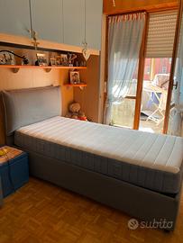 Strutturara letto contenitore+materasso 90x200 conpreso di testiera con cuscino incorporato.