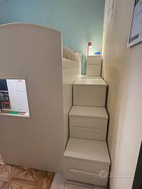 Solizione ideale per una cameretta piccola con due bambini/ ragazzi! Letto a castello con scalette a cassetti e paserella per il letto superiore contenitore a pozzetto, cassetti sotto il letto inferiore. Il letto superiore é molto comodo e vivibile, ci sta anche un comodino. Tanti spazi per contenere giochi o altro. Acquistato 5 anni fa da mondo convenienza a 1200€, in ottimo stato vendo alla metà per cambio casa, compreso i due materassi e le reti a doghe. La soluzione é angolare ma reversibile ed eventualmente modificabile. Ingombro totale a terra 216x145. Già smontato e pronto al ritiro in un locale al piano strada! Ritiro a Brescia.