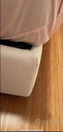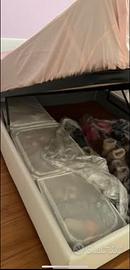 Letto contenitore con doghe in legno di Mondo Convenienza, l’imbottitura del giro letto e della testata è completamente sfoderabile e lavabile perché ha il velcro.