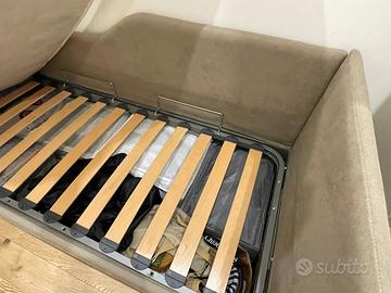 Vendo letto singolo 80x190 con contenitore, rivestito in tessuto colore beige/tortora, in ottime condizioni. Struttura con mezza sponda laterale, rete a doghe in legno e ampio vano contenitore sottostante, molto capiente e comodo per riporre coperte o cambi stagione. Incluso materasso una piazza Permaflex in buono stato. Misure: lunghezza 190 cm, larghezza 80 cm. Letto solido, moderno e perfetto per cameretta o stanza ospiti. Ritiro a mano piano terra, zona Corso Trieste. Scrivere su WhatsApp se interessati: 3332036506. Prezzo 220 € trattabili.