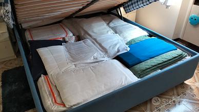 vendesi struttura letto matrimoniale con contenitore e materasso, 190x160, colore blu jeans, testata imbottita, stoffa di qualità, ben tenuto, smontaggio e ritiro a carico di chi acquista, disponibile da settembre, prezzo trattabile