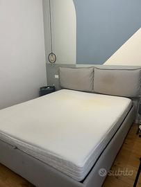 Letto contenitore Ikea, con testata in tessuto colore grigio, e materasso (160 x 200 cm). Il letto è in ottime condizioni presenta solo qualche macchia sulla testata.