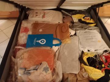 Vendo causa trasloco Letto matrimoniale contenitore di stoffa blu, con pediera, tastiera, longheroni, misure indicative con struttura cm 210x 170, completo di rete dimensioni cm 190x160 no materasso.