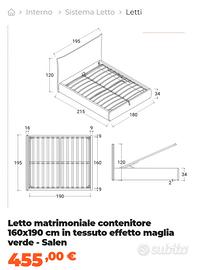 Misure letto 160 x 180. In tessuto verde oliva, molto bello! A chi è interessato mando foto reali e dettagliate. Pagato 455 euro, con spedizione 535.