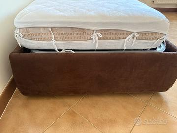 Struttura Letto contenitore + materasso eminflex + coprimaterasso Ottime condizioni - Vendo perche’ usato poco Ampio contenitore come da foto Colore marrone materiale similvelluto Disposable da subito