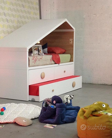 letto Cottage è assolutamente innovativo, nel concept e nel design, è infatti una vera propria "casa" dentro la stanza, un rifugio per i vostri bambini e ragazzi. E' costituito da una struttura superiore con tetto a falda, e da una inferiore con 3 cassettoni, uno dei quali può diventare a tutti gli effetti un secondo letto.