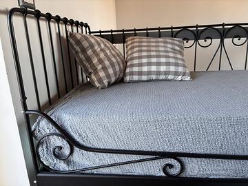 Letto divano daybed IKEA in ferro battuto nero, stile classico con eleganti volute decorative. Completo di rete a doghe in legno, materasso 10cm come nuovo e cuscini. Struttura in ottime condizioni, solida e senza difetti. Perfetto come divano di giorno e letto singolo di notte. Disponibile anche un secondo materasso in poliuretano da 20cm, nuovo e comodissimo, a €50 aggiuntivi. La cover grigia visibile nelle foto non è compresa. Ritiro in zona Formello (RM).