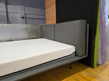 Letto Moderno Enea Stilfar Italia con effetto sospeso, cioè il letto sembra sospeso a mezz'aria grazie ai piedi in plexiglass o molto sottili, dal piano di appoggio del materasso in legno pieno sottile e dal disegno lineare per un Design d'effetto, un protagonista dell'arredo della camera da letto e della casa.