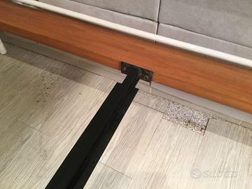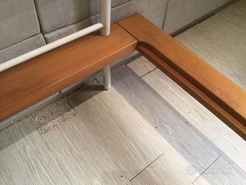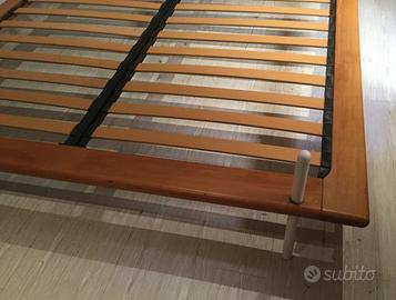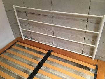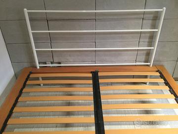 Lettio in legno massello con rete in doghe di legno. Testata e piedi in metallo verniciato. Lungh: 2,25 Largh: 2,00 Altezza da terra del piano materasso: 0,40