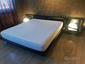 Letto design Morna di Afra e Tobia Scarpa in pelle nera, prodotto da Molteni negli anni 70. Dimensioni 320x230, la testiera del letto è divisibile a metà. Buone condizioni, alcuni graffi sul bordo e una crepa sul rivestimento lucido del comodino sx,vedi foto.
