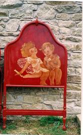 Letto dipinto a mano dalla pittrice Imelda Bassanello di Savona e pubblicato su riviste. Può essere usato sia matrimoniale oppure 2 letti singoli. È compresa la rete a doghe nuova. Vendibile anche singolarmente.