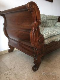 Letto / divano a barca. Soluzione da parete in quanto i cuscini dello schienale del divano devono appoggiarsi ad una parete. Potrebbe essere XIX secolo. Legno noce scuro, tappezzeria in cotone naturale azzurrino / verde acqua a motivi floreali. Misure come un letto singolo 80 x 180 cm. Misure a letto montato 194,5 x 90 e altezza dei laterali 90 cm. Altezza da terra della seduta del materasso 50 cm. Il letto si smonta tutto e ci sta in macchina (massimo ingombro è la parte del materasso che misura 80 x 180 per 20 cm di spessore); ritiro di persona a Saltrio (VA), non spedisco perché è troppo voluminoso. Vendo a 1800 euro trattabili. Accetto pagamento paypal o bonifico bancario. Per altre informazioni o foto, scrivetemi.Grazie, Francesco
