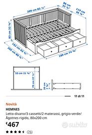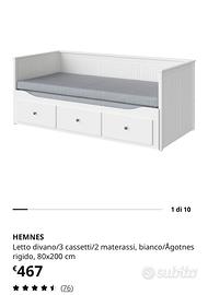 Vendo splendido letto HEMNES IKEA, in condizioni ✨ PARI AL NUOVO ✨, perfetto per chi cerca stile, funzionalità e massimo risparmio! Questo mobile è un vero 4-in-1: 🛋️ DIVANO elegante durante il giorno 🛏️ LETTO SINGOLO (80x200 cm) 👨👩👧 LETTO MATRIMONIALE (fino a 160x200 cm) per ospiti inattesi 📦 MAXI CONTENITORE grazie ai 3 ampi cassetti salva-spazio per coperte e vestiti! 🔹 DETTAGLI INCLUSI: • 🏷️ Modello: IKEA HEMNES • ⚪ Colore: Bianco (shabby chic style) • 🛏️ INCLUDE 2 MATERASSI rigidi Ågotnes pulitissimi e igienizzati (valore extra notevole!) -📏 Dimensioni: 80x200 cm (aperto diventa 160x200 cm) 💰 RISPARMIA SUBITO! • 💶 Prezzo NUOVO in store/online: 467 € • 💲 Prezzo richiesto: solo 375 €! (Risparmi oltre il 20% su un prodotto impeccabile!) 📍 INFO PER IL RITIRO: • 🏠 Località: Bari (zonaParco 2 giugno) • 🛠️ Smontaggio e Trasporto: A totale carico dell'acquirente. (È necessario un veicolo capiente e attrezzatura per lo smontaggio). 💬 Contattami subito! Non lasciarti scappare questa occasione! Il letto è disponibile per visione.