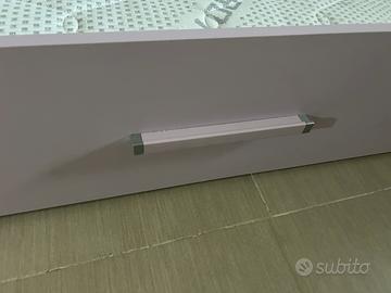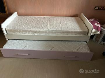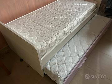 Letto singolo mondo convenienza, struttura bianco ghiaccio effetto legno con rifinitura in rosa pastello con dopoio letto estraibile per farlo diventare matrimoniale.