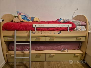 Letto doppio, uno sopra fisso e quello sotto estraibile. Dotata di 2 cassetti, 2 ripiani scrivania estraibili e 2 cassettoni inferiori. Usato in buono stato, sono presenti solo alcuni adesivi sulla sponda, come visibile in foto. Smontaggio a carico dell’acquirente.