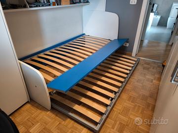 Sotto il letto c'è una rete a doghe aggiuntiva con gambe ripiegabili e con materasso, estraibile lateralmente dalla spondina a ribalta della struttura del letto.