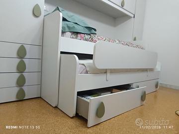Letto doppio a scomparsa con cassetti e sponda rimovibile. Struttura bianca, doghe in legno, tute in entrambi i letti. Misure: "letto sopra" 208.2x92x100.3 - "letto sotto" 200x89x56.5 - cassetti n°2 97x50 - sponda 97x50, 2 materassi singoli inclusi
