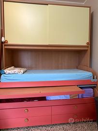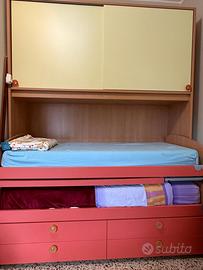 Vendo letto a ponte in legno color salmone e beige, ideale per camere da ragazzi o ambienti con poco spazio. La struttura è solida e funzionale, completa di: