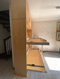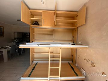 Vagone è un letto a castello a scomparsa che trova la sua collocazione ideale nella camera dei ragazzi. I suoi punti di forza sono il design originale e moderno (con la scaletta in legno a vista)