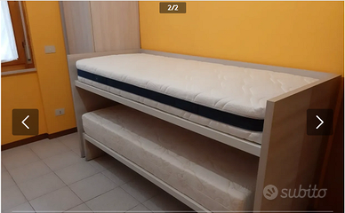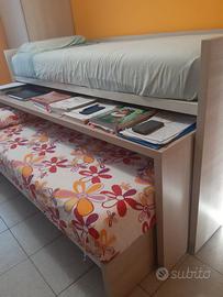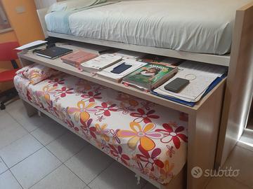 LETTO doppio scorrevole duetto Picasso DOIMO City Line con comodissima e spaziosa SCRIVANIA in mezzo. Ogni pezzo è su rotelle che si bloccano, quindi molto comodi da spostare anche per le pulizie. Misure: letto superiore: larghezza 86, lunghezza 213, altezza 110; scrivania: larghezza 59, lunghezza 202, altezza 73; letto inferiore: larghezza 86, lunghezza 192, altezza 32; In perfette condizioni: comprati nuovi e usati solo per un 1 anno e mezzo per trasferimento casa. Roma zona Torrevecchia