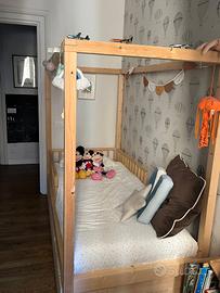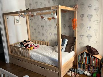 Vendo letto evolutivo Nabè Dream con tetto a baldacchino, in buone condizioni. Struttura solida di legno massello e di design, perfetta per cameretta Montessori. Include anche: -Modulo estraibile che può essere utilizzato come cassettone contenitore oppure, inserendo le doghe incluse, come secondo letto (ideale per ospiti o fratelli) -Sponde laterali e testiera -Kit piedini per utilizzare il letto direttamente appoggiato a terra, senza cassettiera (ideale per bambini più piccoli) Condizioni: Il letto è in buono stato generale. Presenta solo una zona su una delle spondine con segni di pennarello e alcuni segni di pennarello su un montante verticale. La spondina eventualmente è facilmente sostituibile con una spesa contenuta (50 euro circa). Già smontato, pronto per il ritiro a Roma (quartiere Trieste) Valore del nuovo oltre €1000 Prezzo richiesto: €500