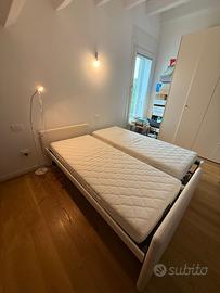 Vendo letto originale Flou modello Duetto, che presenta un secondo letto singolo estraibile incluso. Il prezzo include anche due materassi singoli.Il letto occupa 97X213 con altezza di 72. Il letto sottostante è singolo standard con una struttura di 80x190cm. Il rivestimento è in bianco, presenta alcune graffiature ma niente di eccessivamente visibile. Il prezzo include anche due pistoni di metallo con copertura in gomma per tenere il letti uniti. Il prezzo originale del letto è di 2500 euro più materassi e accessori, La Flou è una marca affidabile sinonimo di duratura nel tempo.