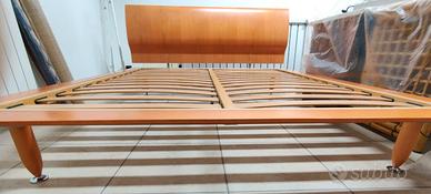 Letto a due piazze in ciliegio naturale con sistema di doghe integrato e perfetto. I piedi sono in legno e terminano in acciaio in perfetto stato. Il comodino coordinato al letto è di ciliegio massello, consta di due cassetti. Il letto ed il comodino coordinato sono di design, di Falegnameria 1946. In dotazione verrebbe anche dato il secondo comodino, un tavolino di Gervasoni ed il capezzale.