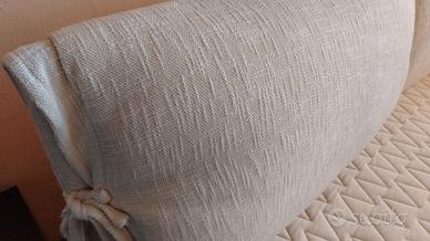 Letto matrimoniale contenitore, con testiera imbottita in tessuto color crema, comprensivo di materasso in buono stato, perché usato poco.