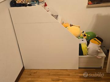 letto per bambini rialzato con tenda sotto e possibilità di mettere il tunnel sopra. Scaletta contenitore per facilitare la salita.