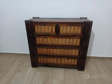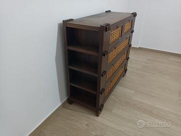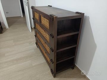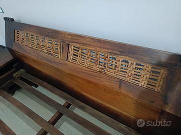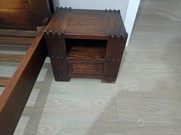 Letto con rete ila doghe integrata, comodini e comò stile etnico. Legno massello, solo parte destra decoro letto (vedi foto) da sistemare se si vuole.
