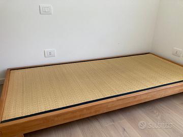 Letto ecologico Feng Zen in faggio lamellare verniciato vegetale ad incastri senza elementi metallici con doghe, misura cm 90 x 200 (piu 3 cm esterni per lato). Tatami ovvero stuoia in paglia di riso pressata, rivestita in giunco che i Giapponesi usano come pavimento e su cui dormono appoggiando il futon.