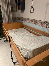 Letto elettrico per degenza con sponde e ad altezza variabile Intermed. Letto elettrico ad altezza variabile con movimentazione articolata del piano rete dotato di doghe in legno e pannelli laterali in legno. Sponde regolabili in alluminio. Letto elettrico con funzione Trendellemburg e Anti-Trendellemburg.