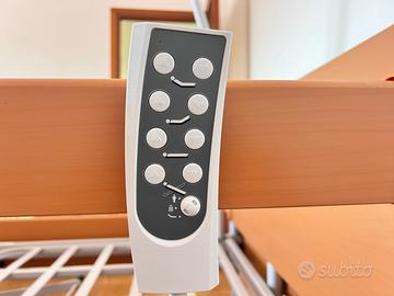 Letto elettrico con rete metallica dotato di struttura in legno dalle forme squadrate.