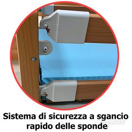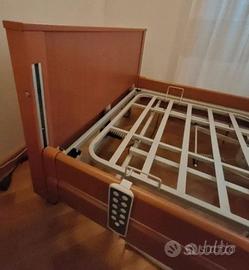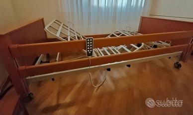 Letto da una piazza e mezzo, dotato di robusta struttura in legno e rete metallica. Sponde laterali di contenimento regolabili in altezza Blocchi ferma materasso sulla rete Quattroruote piroettanti con freno di stazionamento Regolazione elettrica dello schienale e della parte cosce /gambe Telecomando Triangolo solleva malati di serie Carico massimo di sicuro utilizzo: 180 kg • Larghezza rete: 120 cm • Larghezza massimo ingombro: 138 cm • Lunghezza rete: 200 cm • Lunghezza massimo ingombro: 221 cm • Altezza rete da terra: regolabile da 31 cm a 71 cm • Altezza pediera e testiera: 61 cm • Altezza sponde dalla base del materasso: 37cm • Schienale: regolabile da 0° a 70° VERO AFFARE COSTO AL NUOVO 1800 Euro