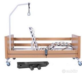 Telaio rete – Struttura portante perimetrale esterna costruita in profili di legno a sezione rettangolare. Telaio a 4 sezioni mobili realizzato in tubo di acciaio a sezione tonda con piano rete in doghe di legno e guide reggi-materasso. Dotato di un attacco per asta solleva-malato. Sezione alza-busto e sezione gambe regolabili tramite un attuatore elettrico moteck fd60 con telecomando a filo dotato. Sezione piedi con regolazione manuale dell’inclinazione, a cremagliera. Sezione bacino fissa. Dotato di asta solleva-malato completo di maniglia e cinghia in nylon regolabile Altezza variabile – La movimentazione verticale del piano rete compresa tra circa 38 cm di altezza minima e 79 cm di altezza massima è regolabile mediante attuatori elettrici inseriti internamente ai pannelli delle spalliere del letto. materasso antidecubito non ad aria.