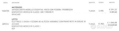 Vendo letto elettrico sanitario completo composto da: - Letto elettrico KSP modello A8931A a 3 snodi e 4 sezioni, con altezza variabile e piano rete in doghe di acciaio – dispositivo medico di classe I - Materasso antidecubito Invacare Essential Visco con fodera 195×88×12 cm – dispositivo medico di classe I (DM 1390458/R) - Montanti aggiuntivi per sponde laterali KSP per letto modello A8931A Tutto acquistato presso sanitaria della zona e PERFETTAMENTE funzionante. Prezzo di acquisto (come da fattura): - Letto elettrico: € 1.040,08 - Materasso antidecubito: € 291,22 - Montanti per sponde laterali: € 260,00 Vendo causa inutilizzo tutto insieme a € 900. Disponibile per ritiro in zona provincia di Perugia.