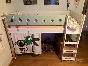 Letto elevato Flexa modulabile, può diventare letto a castello. Completo di materasso (90x190cm) e tendina.