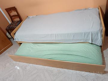 Come da foto, vendo letto estraibile con rete metallica a molle antiaffossamento. Il cassetto contenitore (come si vede in foto) è dotato di ruote che facilitano l'estrazione dello stesso. I piedi del letto vengono giù in automatico non appena si solleva la rete. Il che rende l'apertura dello stesso molto semplice. Entrambe le reti hanno misura 90x190. Per chi volesse, i due materassi sono inclusi nel prezzo.