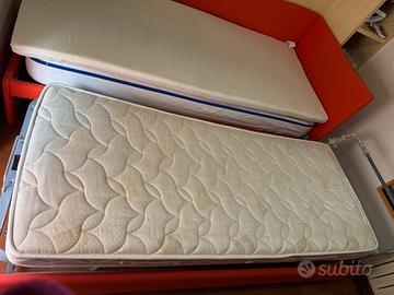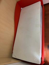 Letto singolo con giroletto ricoperto in stoffa rossa,80x190,secondo letto estraibile completo di materassi e topper,ottimo stato