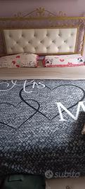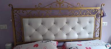 Letto ferro battuto color oro con testata in ecopelle bianca in ottime condizioni con rete a doghe in legno
